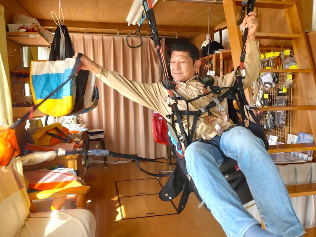 大柳さんのレスキューパラシュートシミュレーション。O2ハーネスはグリップからコンテナまでが長いね。違いが分かる男になりました。