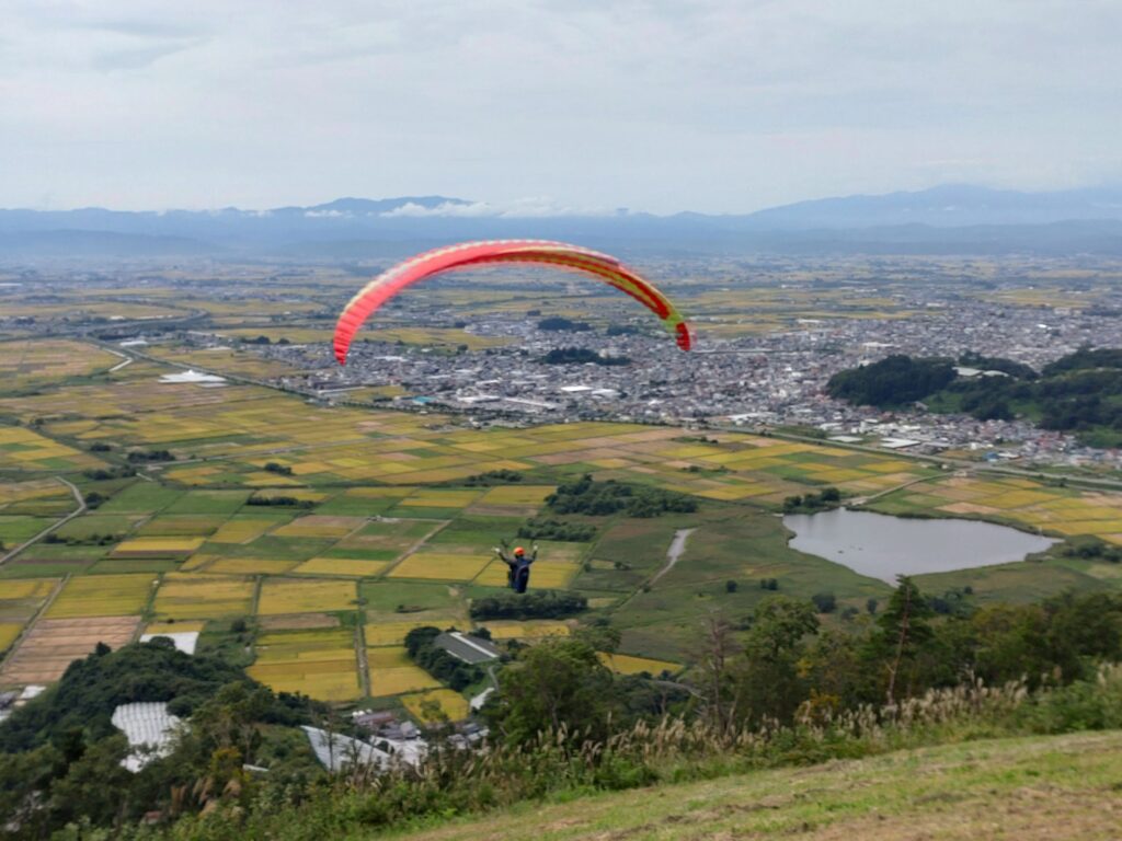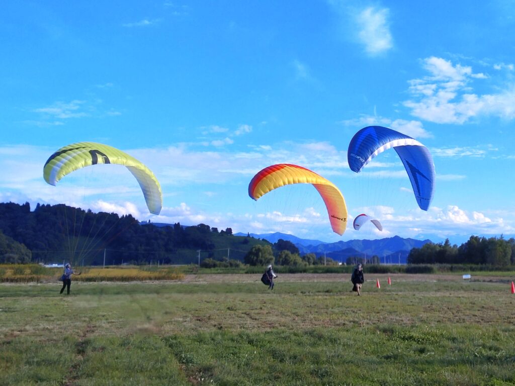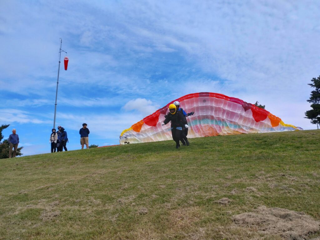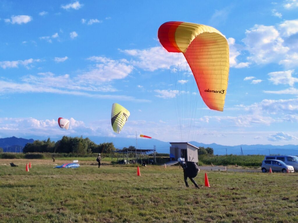 秋の移動性高気圧の中心は北にあり本流は東風。朝凪でフライトした後は東風が支配的になりましたが、南斜面からのサーマルが立ち上がり始めた午前11時半頃に飛び立ったパイロットの皆さんは海抜1,500mまで上げていました。涼しいランディングにはグランドハンドリングに最適な東風が吹き込みスクール生もパイロットも楽しく練習出来ました。