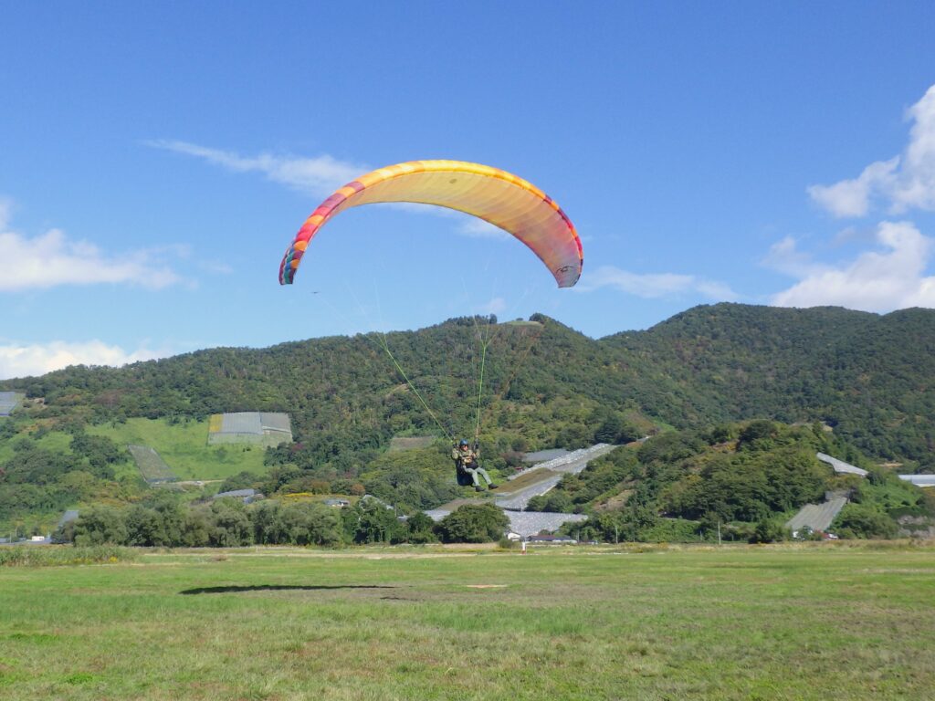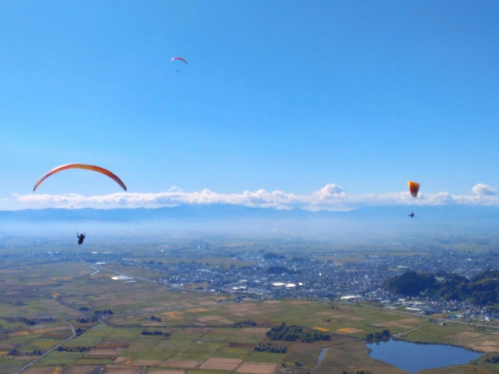 高気圧に覆われ素晴らしい青空とサーマルに恵まれました。雲海が消えると10時頃からフライト開始。静大気の中でテクニカル練習が効率よく進みました。古関さんはB級パイロット実技検定合格です。おめでとう。午後1時位から穏やかなサーマルが立ち上がりうまく捕まえたパイロットの皆さんは海抜1,200mまで上げて秋の空を満喫していました。