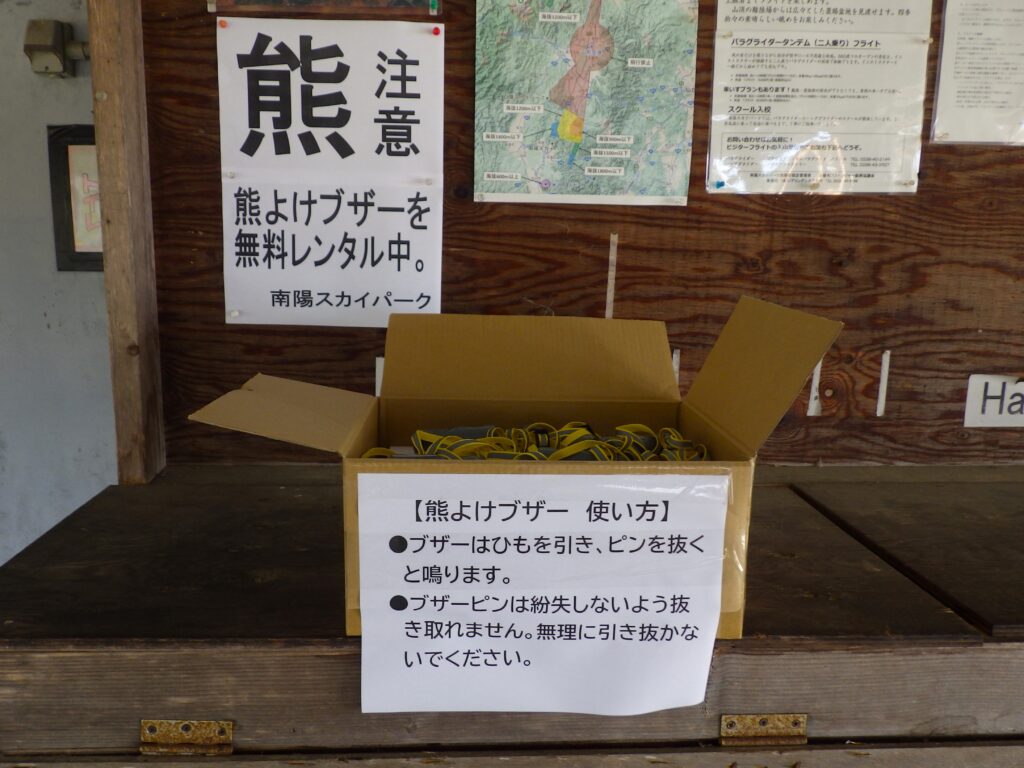 山頂ログハウスの受付に熊よけブザーを用意しました。ご安全に!