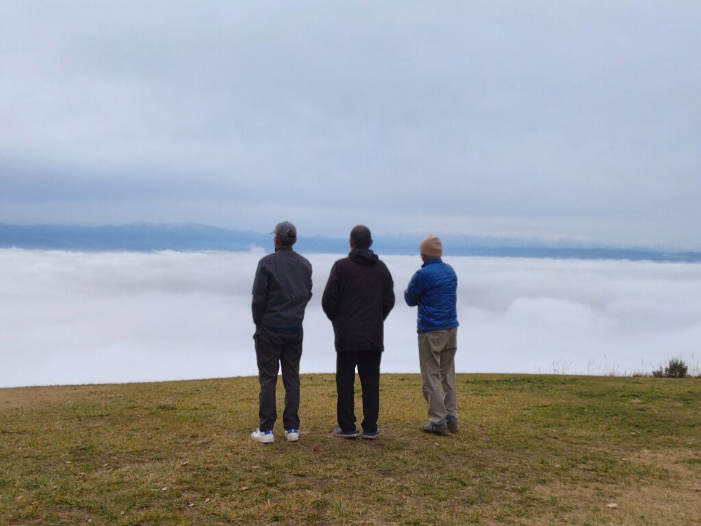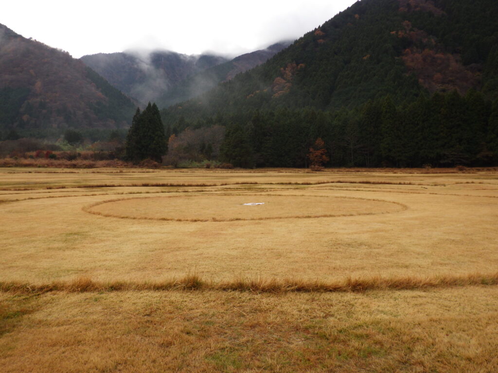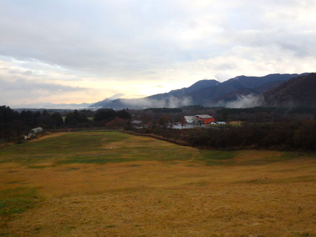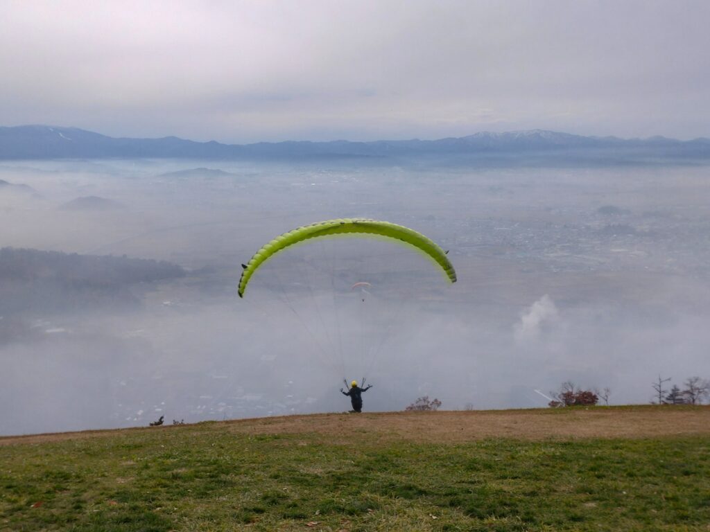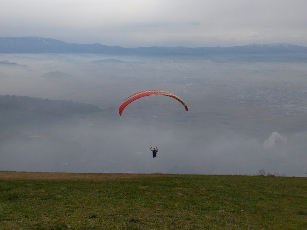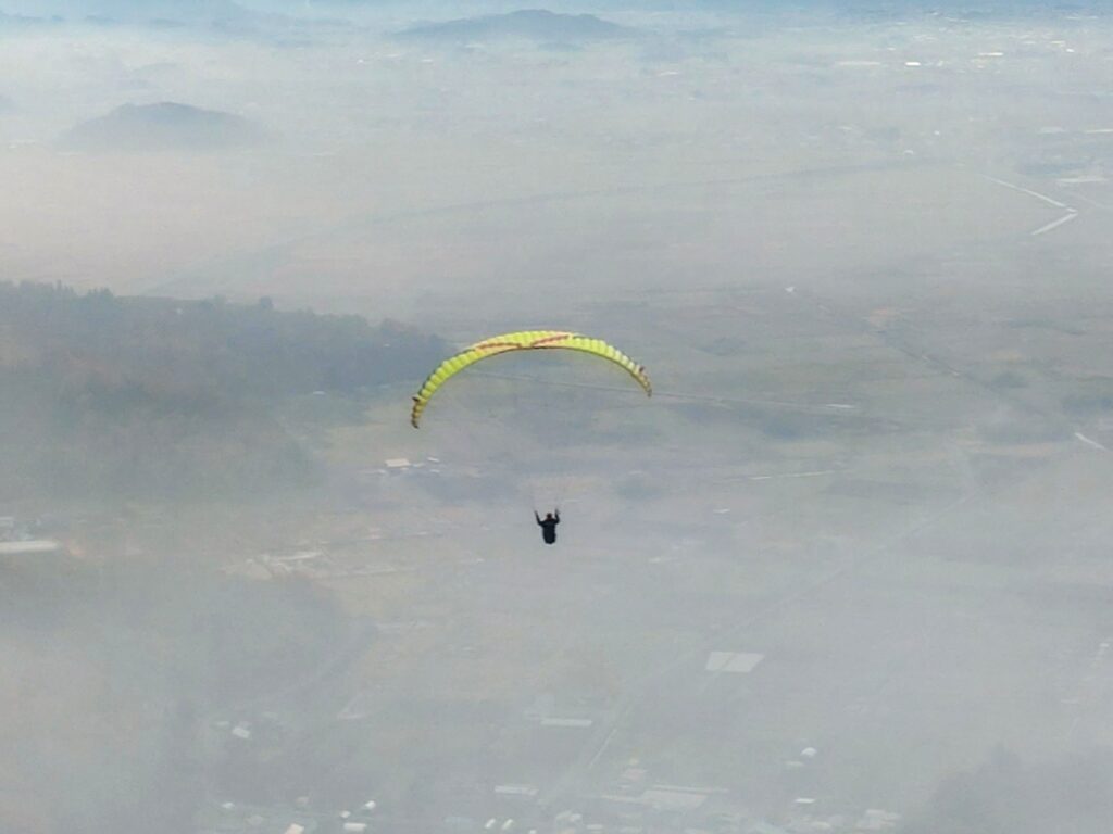 冷え込みで強い逆転層が出現。上空は気圧の谷の接近で曇り空。この雲海は消えないかなと諦め半分でイクオフに上がりましたが、午後1時過ぎにフライトできました。校長は早朝の朝霧のなかJHF上級タンデム検定が開催される朝霧高原へ出発、雨の朝霧に。