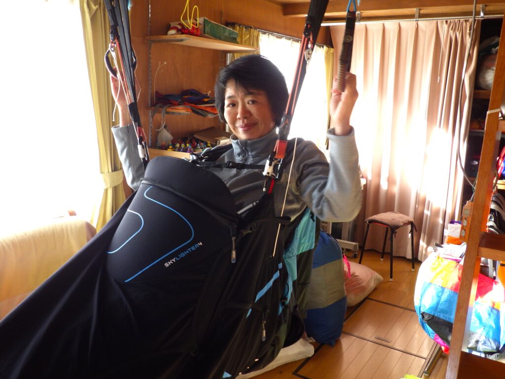 クラブハウスではハーネス研究会。「スカイライター4」のセッティングを出す泉先生。うちの推奨は165㎝位からかな。