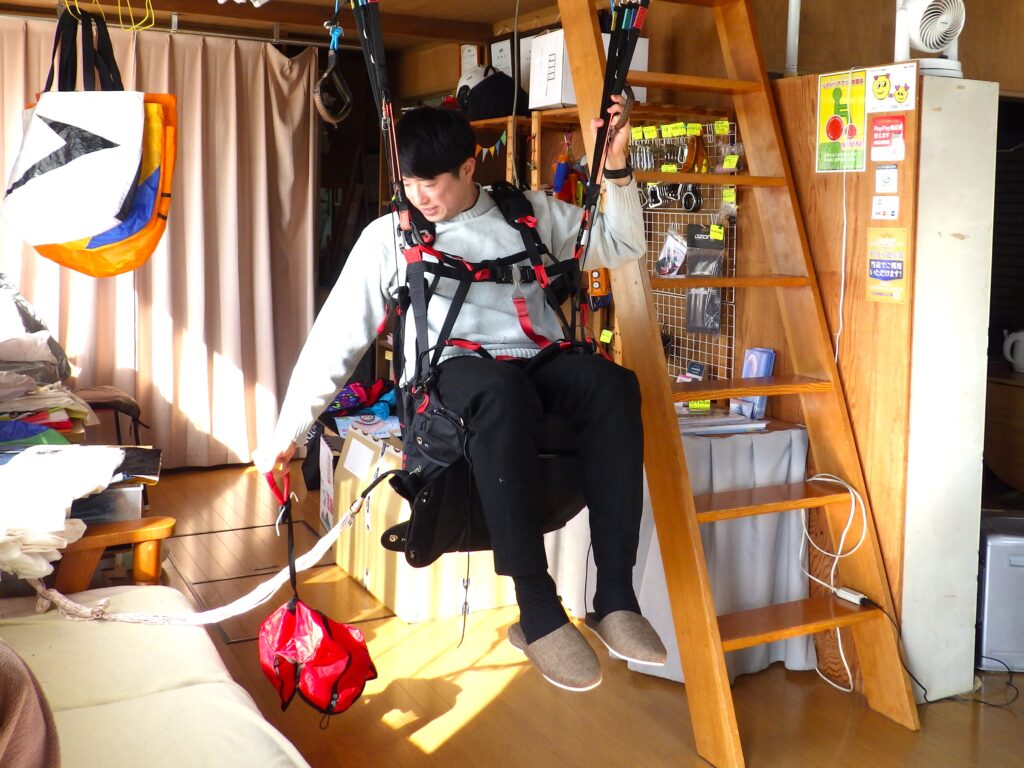 パイロット課程の山口さんは宇都宮ツアーに向けてレスキューパラシュートのリパックに来てくれました。