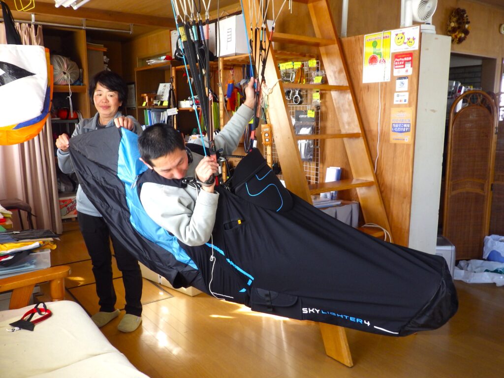 仲野さんの新兵器スカイライター4スペシャルが入荷。細部まで入念に確認していました。(細かい要望にスカイグライダーズの天野さんがバッチリ応えてくれました。校長は美しい仕上がりに感動!)